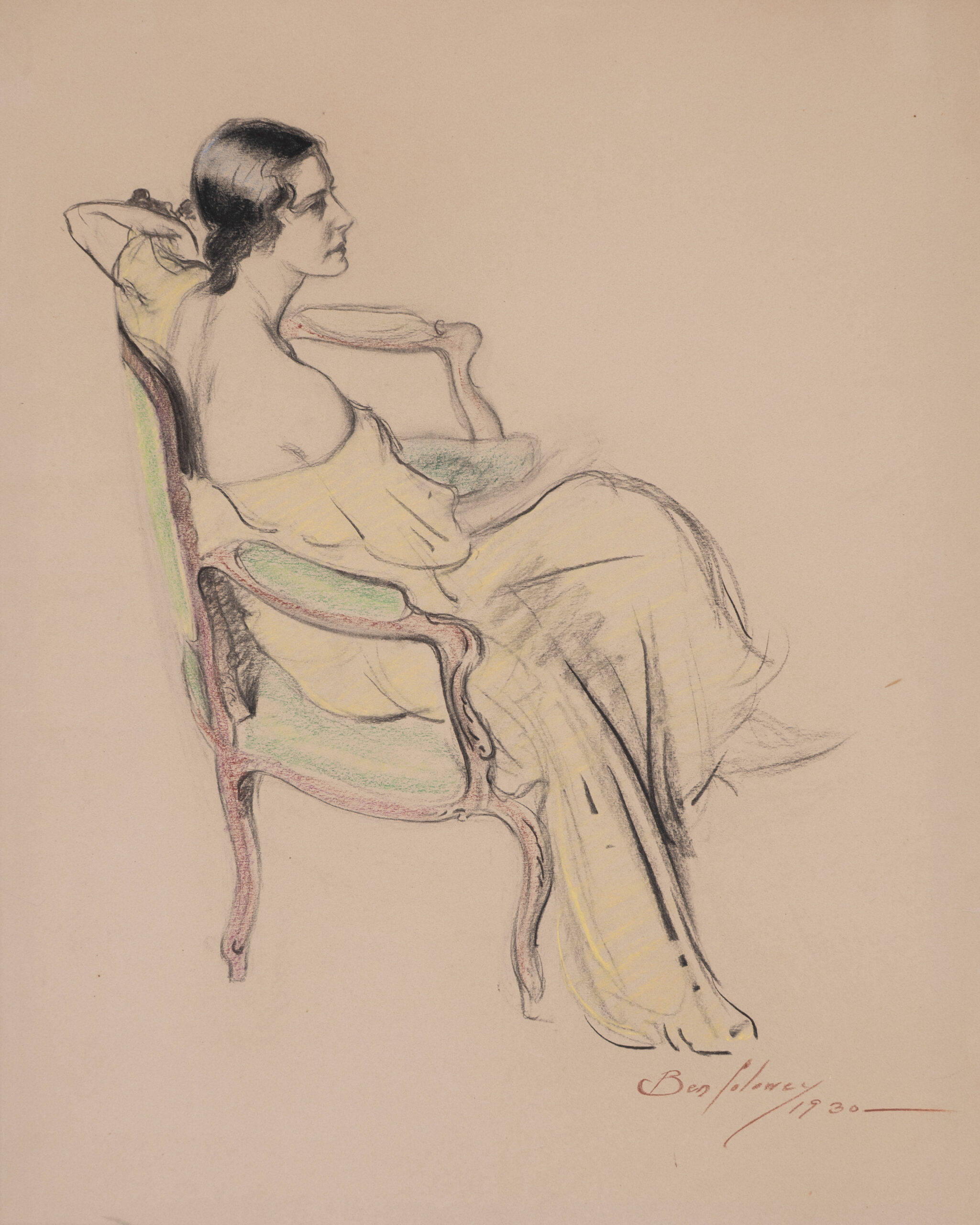 Rae did not wear a traditional white dress for her wedding, but a lovely yellow, off the shoulder gown that would become a part of her wardrobe. She wore it in at least three paintings and drawings by Ben, including this pastel, signed and dated 1930. It is unlikely that this was drawn on their wedding day as Rae was just starting to pose for Ben at that time. It was likely created after their wedding, perhaps after their honeymoon in Casco Bay, Maine that summer. It is the earliest known portrait of Rae in pastel, and like so many others, he captured her in profile. Ben would continue to draw pastel portraits of Rae throughout their marriage, including, what Rae considered her final portrait nearly forty years later (where she was also shown in profile).