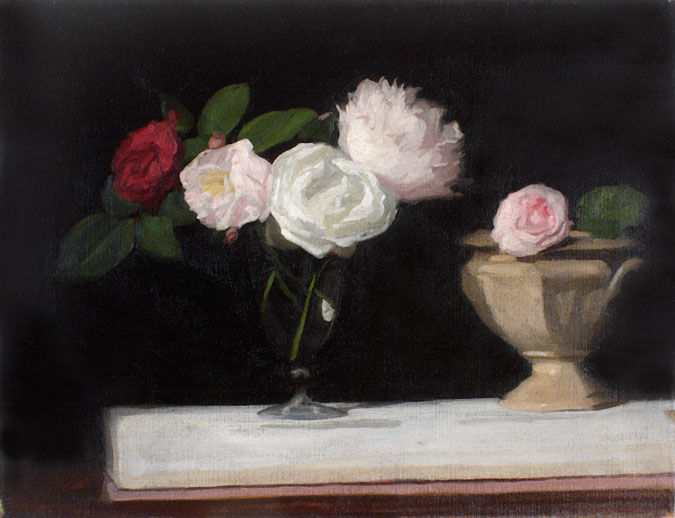 The dark grounds not only create a spotlight effect, they encapsulate the brighter subjects in a cocoon of silence that isolates each group from the outside world. Ultimately, each picture becomes a finely calibrated demonstration of perfect equilibrium involving shape, light, color and texture – the basic tools of painting.